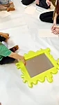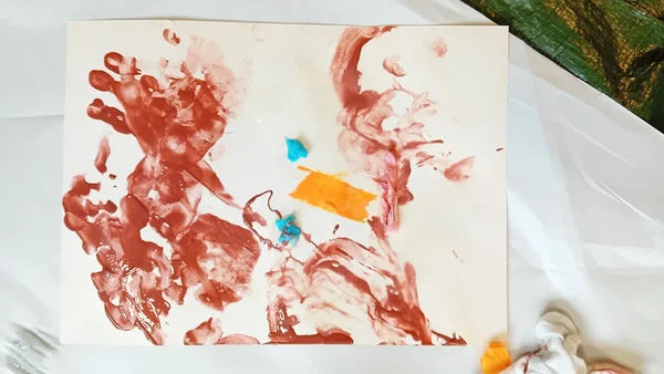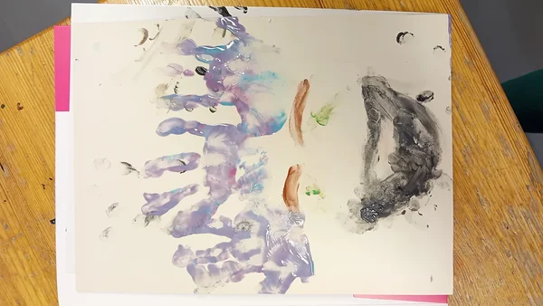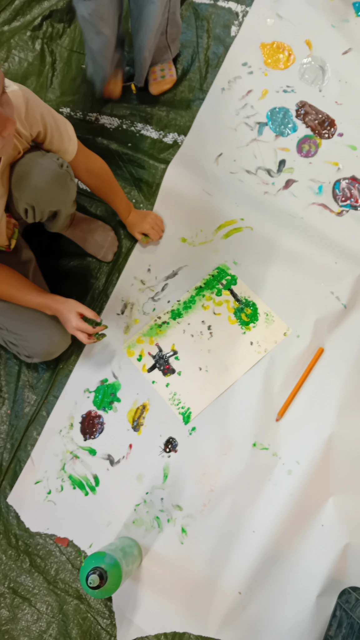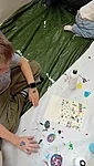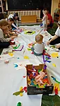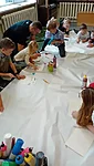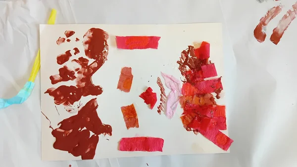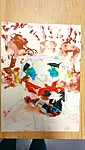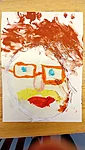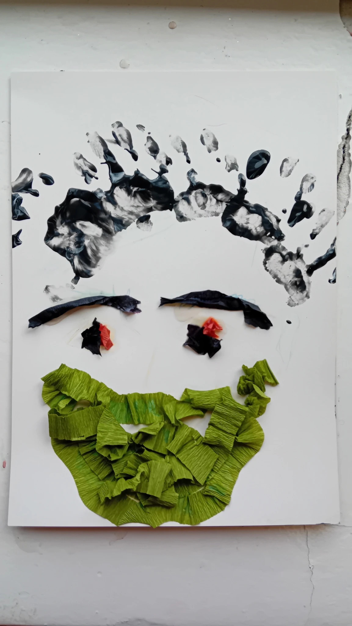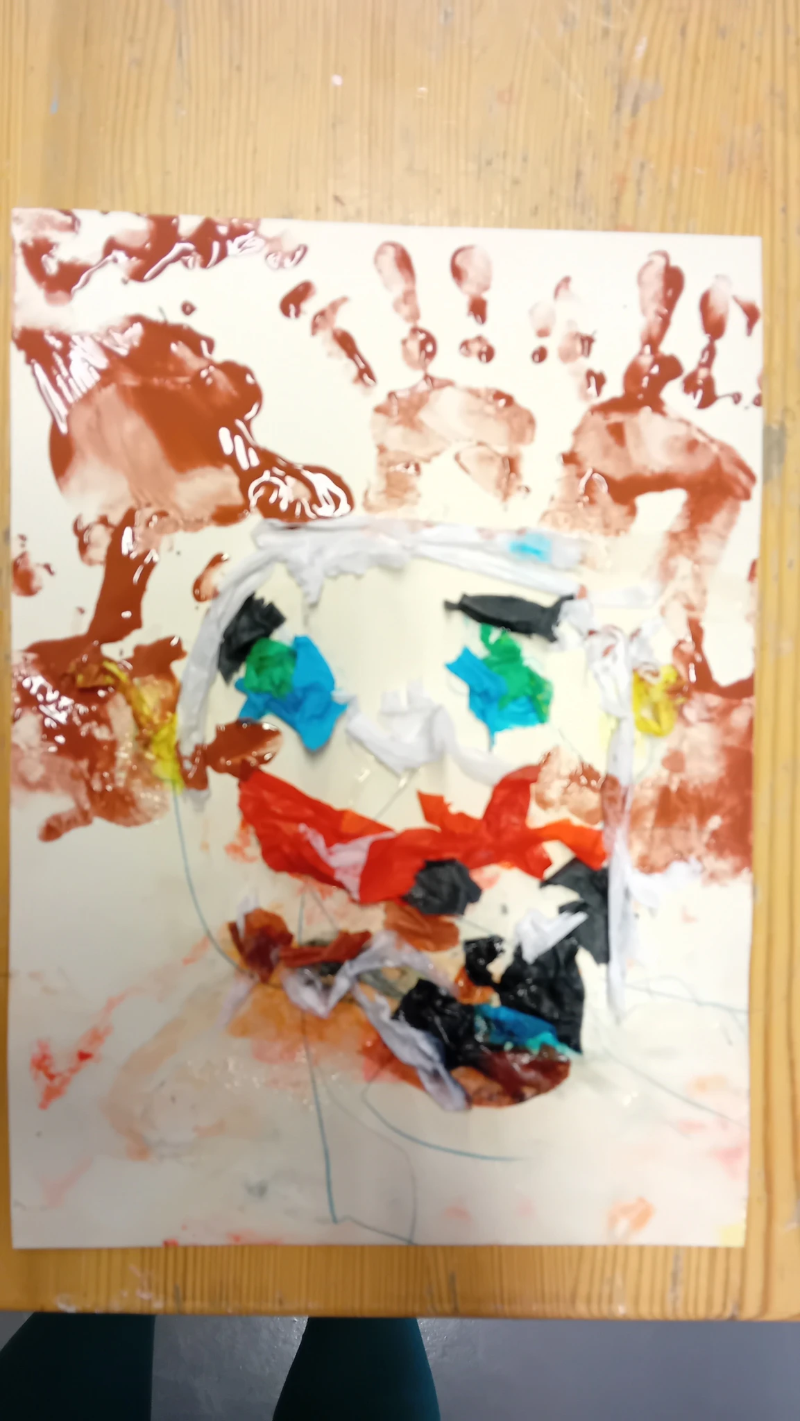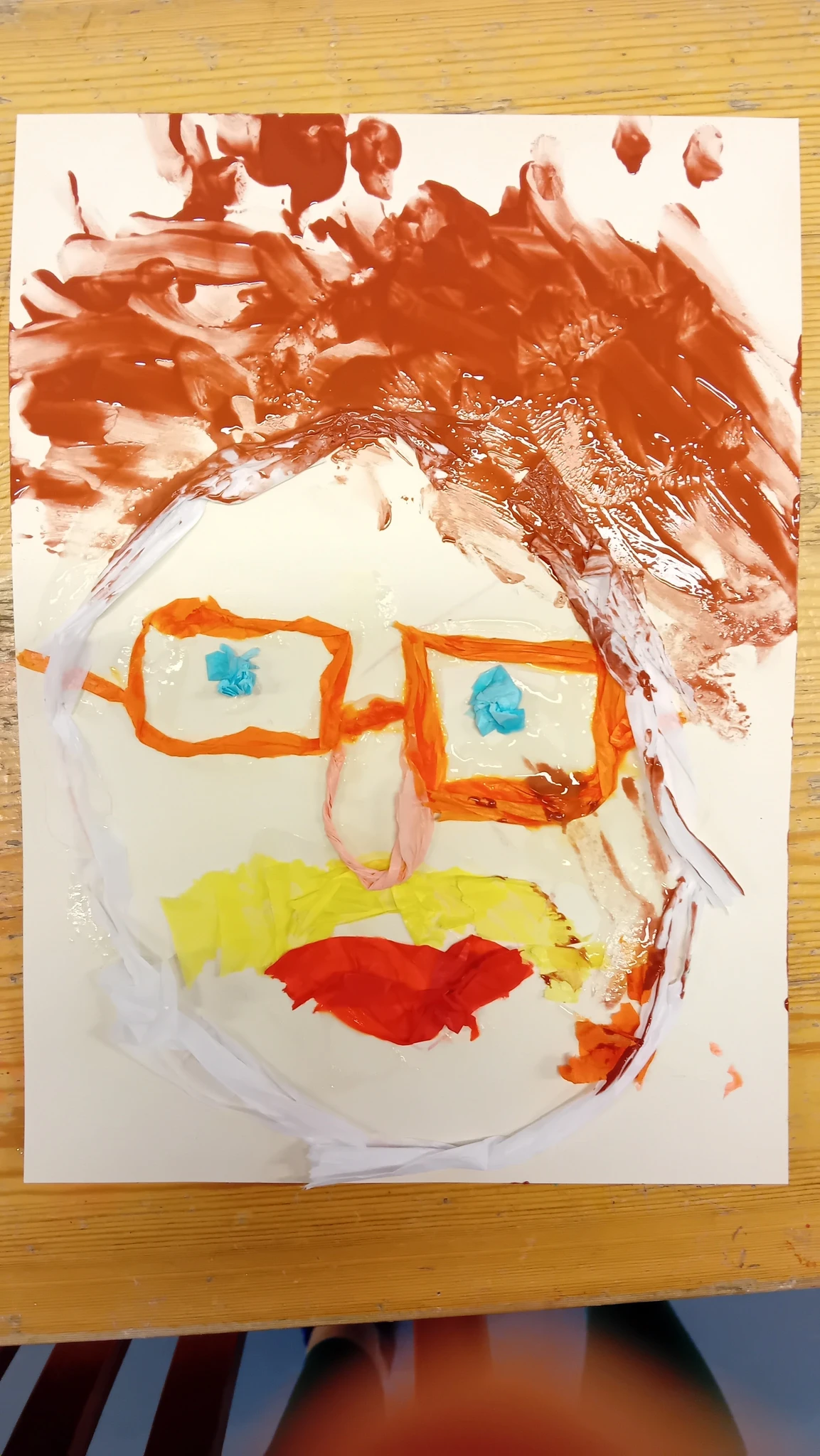 Seejärel hakkasime issi portreed tegema. Joonistasime põhja ette, rebisime-kleepisime silmad, nina ja suu (kasutasime ka peegli abi, et vaadata, kus täpselt need näos paiknevad) ning siis tegime juuksed ja vuntsid ja habemed ka. Juuksed püüdsime teha värvise käega käejälgi vajutades. Küll said vahvad soengud!