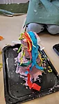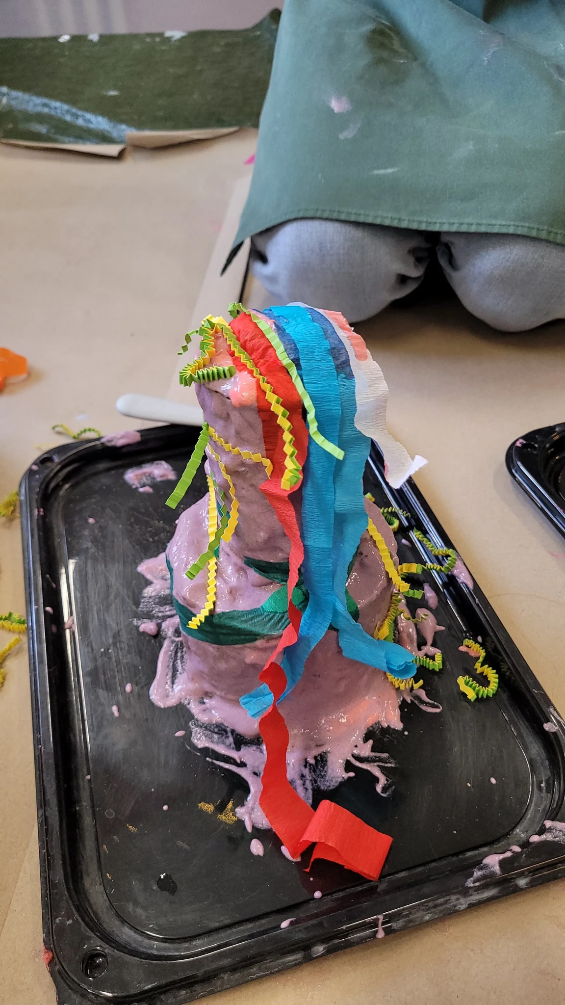Selleks et ühte igihaljast torti “ehitada” olime kogunud Haljaperesse palju papist torusid. Neid oli vaja erineva suurusega, et saaks teha nendest torni. Natukene mängisime nende torudega ja proovisime neid igatepidi kokku sobitada ja erinevaid ehitisi luua. Siis, kui olime tordi tükid välja valinud ja kokku sobitanud, asusime neid kokku liimima. Selleks kasutasime PVA liimi. Siis asetasime liimitud tordi alusele ja hakkasime kausis kreemi kokku segama. Kreem koosnes paksemast kliistrist ja näpuvärvist. Igaüks sai valida, mis värvi kreem tuleb, kas pruun shokolaadikreem, roosa maasikakreem või valge kohupiima/vaniljekreem. Segasime selle kreemi mõnusalt lusikaga kokku ja tõstsime tordile. Tordil ajasime kreemi laiema pintsliga laiali. Panime kreemi täpselt nii palju, et kataks kõik kohad ära. Siis tuli kõige lõbusam osa: kaunistamine. Esimesena võtsime krepp paberit ja tegime sellest väikseid pallikesi või ribasid, mida tordile kinnitasime, siis lisasime veel siksakilisi paberijuppe. Nüüd ka midagi nämmat: vahukomme, shokolaadipalle, ja strösseleid. Lõpetuseks veel plastiliinist isetehtud “mammusid”.
