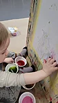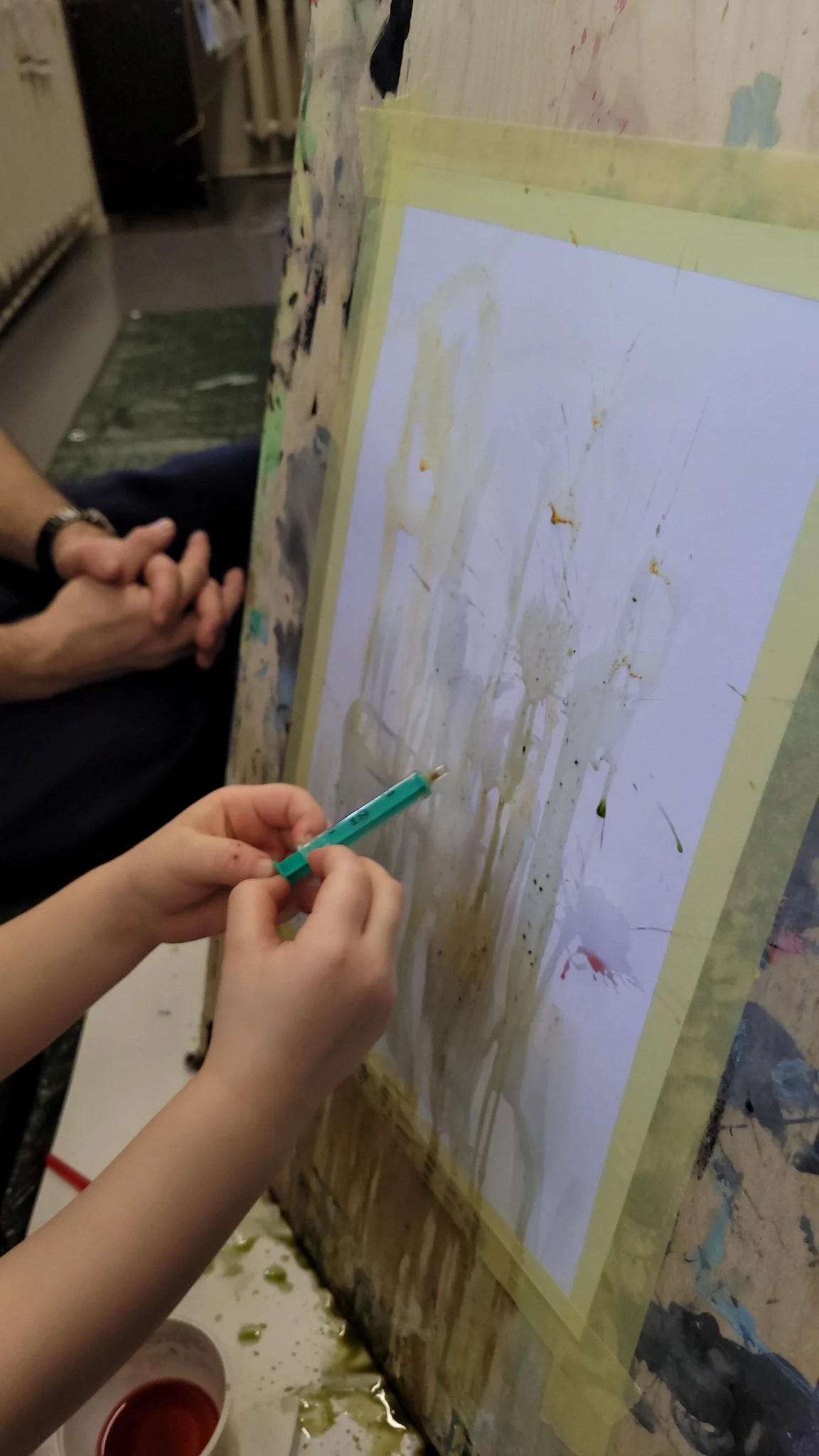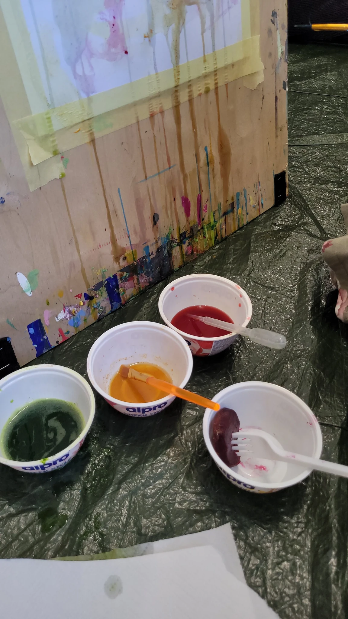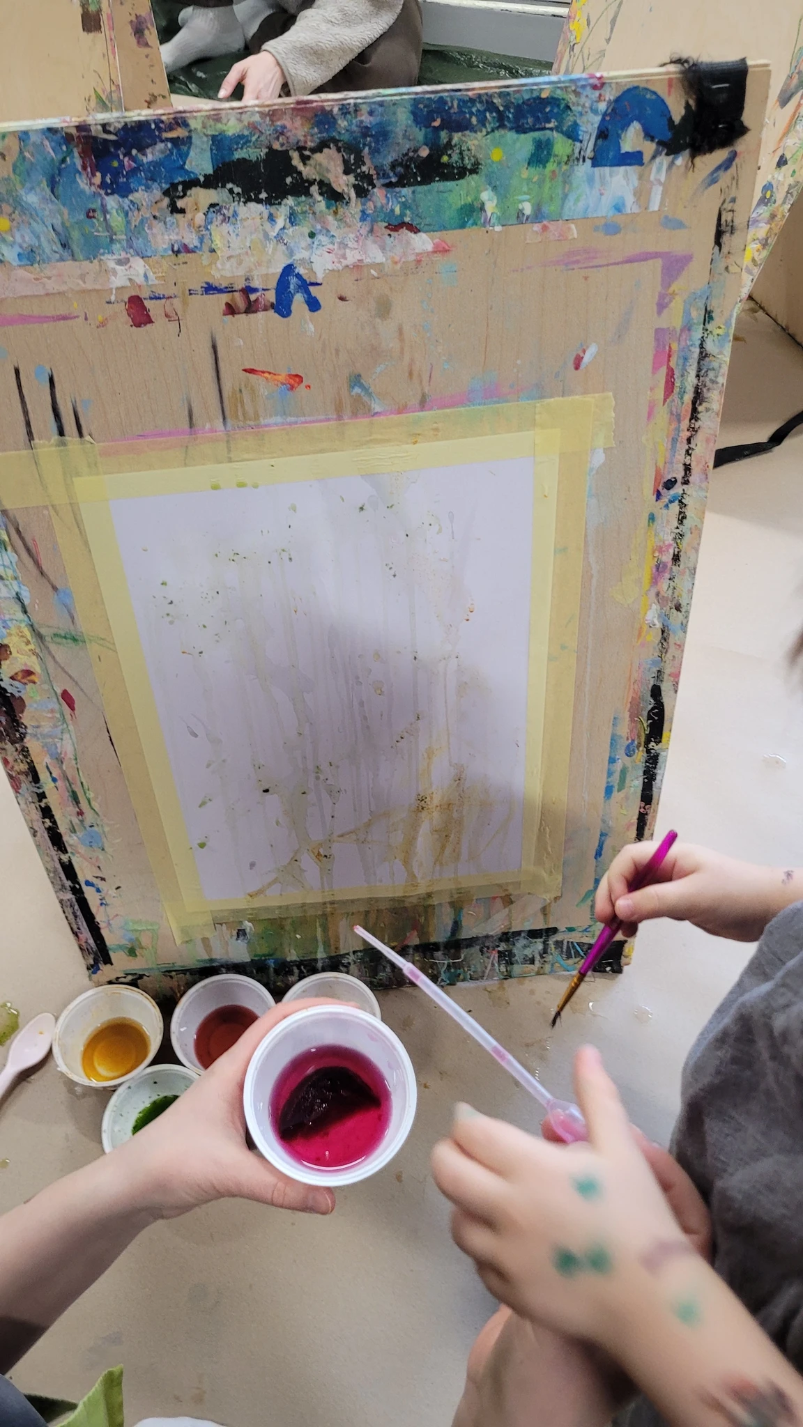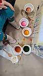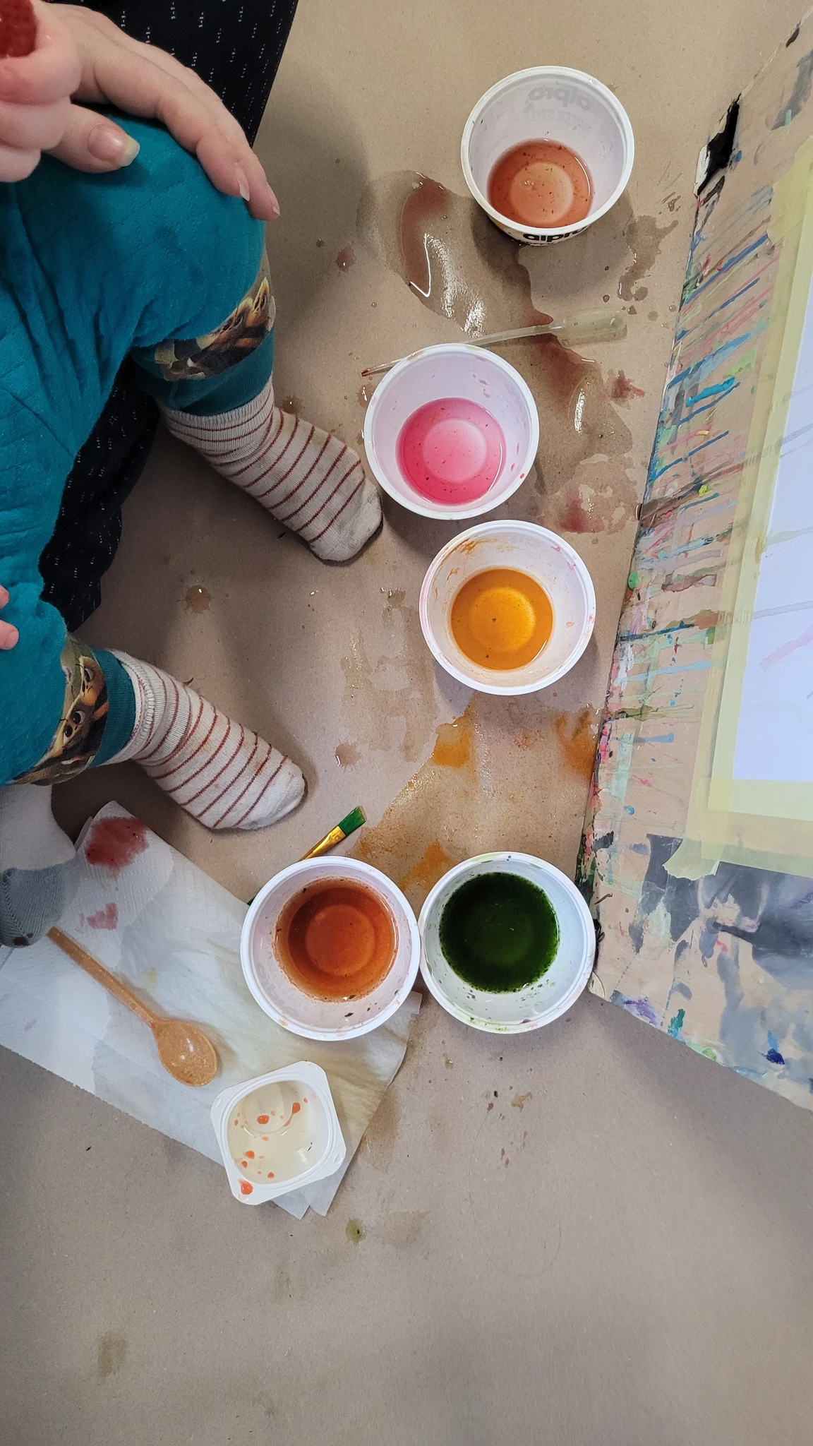 Panime endale seekord valmis maalialused ja kinnitasime sinna teibiga akvarellpaberi. Ja hakkasime justkui laborantideks, kes katsetavad köögis maalimist, muutes toiduasjad värvideks. Oma värvipotskusse segasime kurkumipulbri ja vee abil kollast, paprikapulbri ning veega oranzi ja kohvipuru ja veega pruuni. Siis testisime, kas teetõmmisest saaks mingit värvi. Kõige parem oli kibuvitsateest saadud punane. Punast sai väga hästi ka peeditükist, mida sai otse paberile vajutada. Oranzi proovisime samuti riivitud porgandist saada. Rohelist värvi tekitasime püreestatud spinatist ja lillast viinamarjamahlast. Proovisime peale pintsli kasutada ka pipetti ja süstalt värvi paberile kandmiseks ja niristamiseks. Oli huvitav vaadata, mis vedelikud tekitasid tugevama värvijälje ja mis heledama.