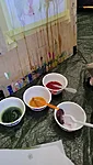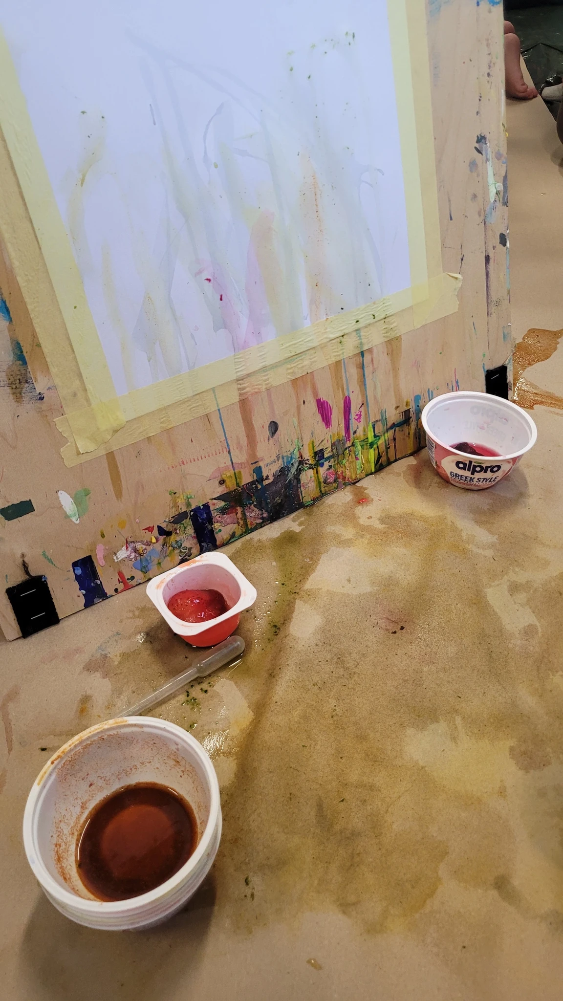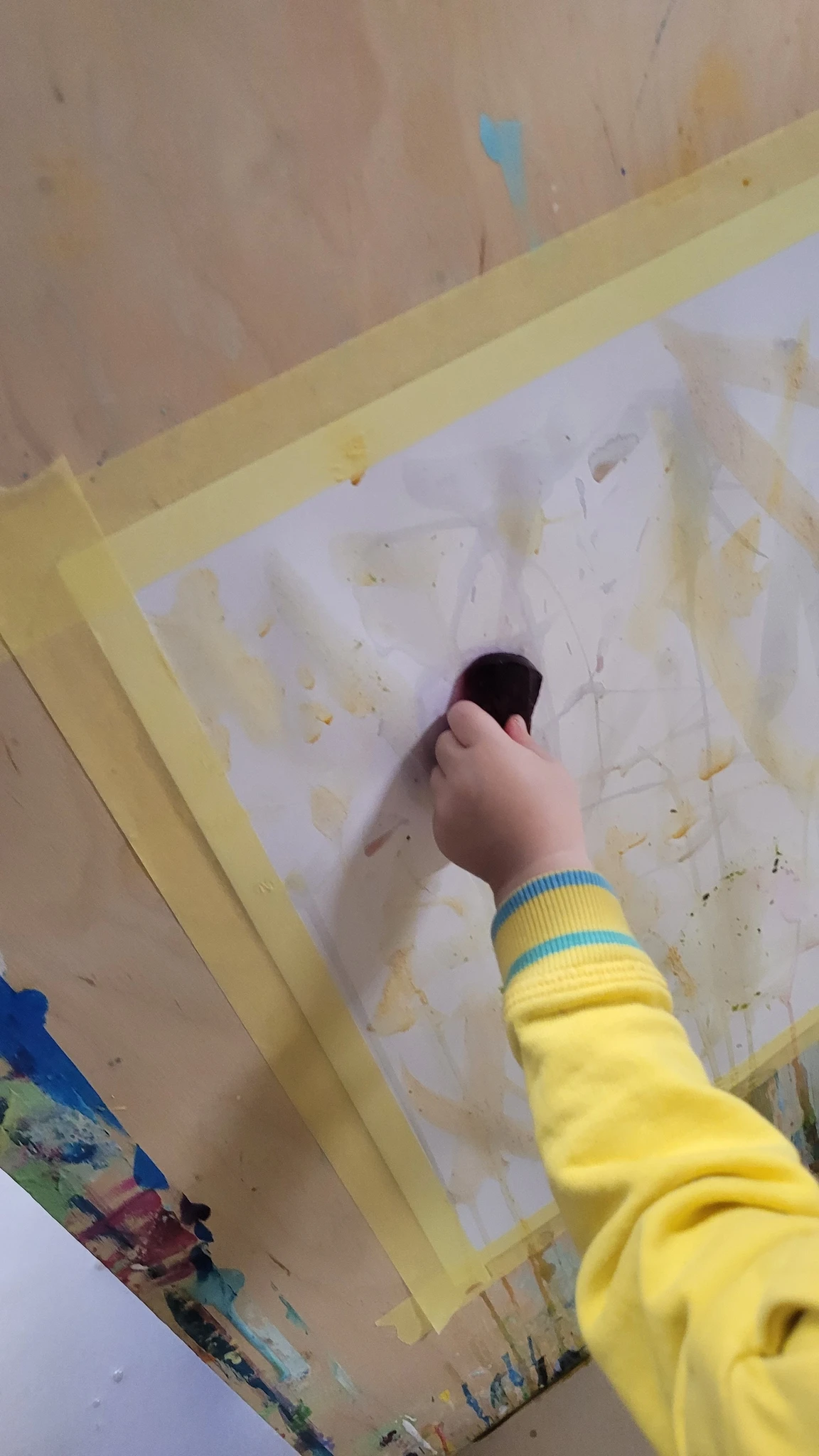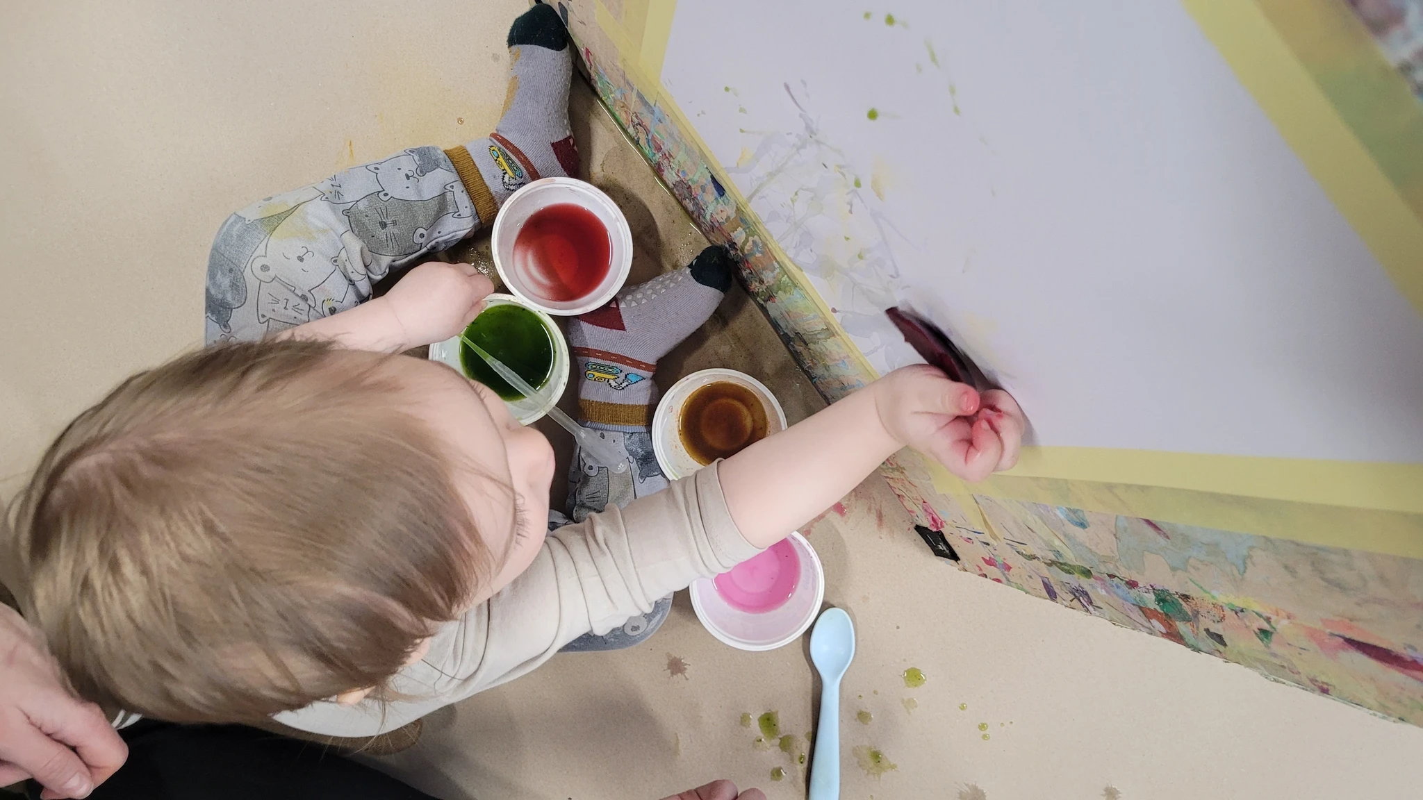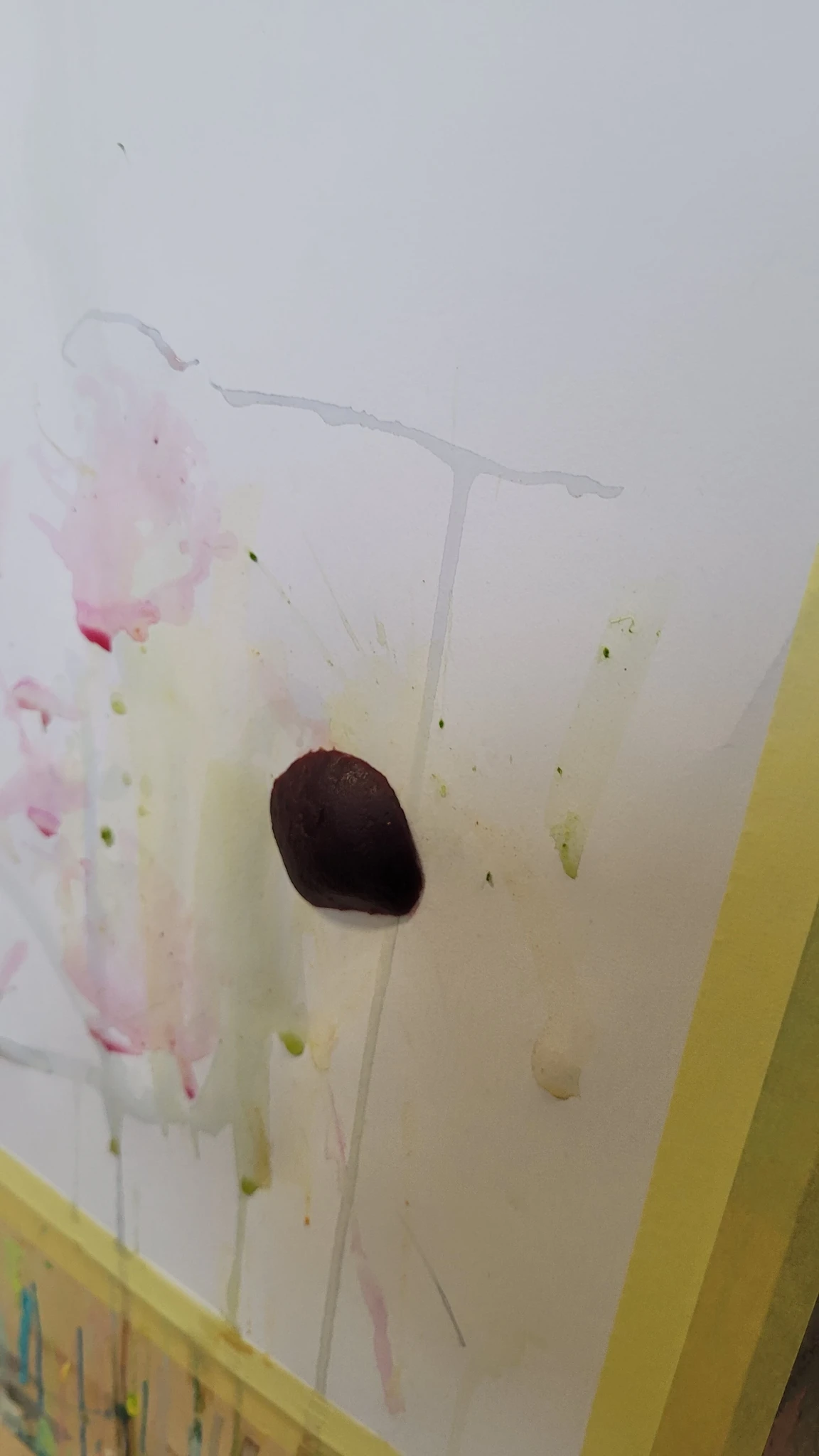 Panime endale seekord valmis maalialused ja kinnitasime sinna teibiga akvarellpaberi. Ja hakkasime justkui laborantideks, kes katsetavad köögis maalimist, muutes toiduasjad värvideks. Oma värvipotskusse segasime kurkumipulbri ja vee abil kollast, paprikapulbri ning veega oranzi ja kohvipuru ja veega pruuni. Siis testisime, kas teetõmmisest saaks mingit värvi. Kõige parem oli kibuvitsateest saadud punane. Punast sai väga hästi ka peeditükist, mida sai otse paberile vajutada. Oranzi proovisime samuti riivitud porgandist saada. Rohelist värvi tekitasime püreestatud spinatist ja lillast viinamarjamahlast. Proovisime peale pintsli kasutada ka pipetti ja süstalt värvi paberile kandmiseks ja niristamiseks. Oli huvitav vaadata, mis vedelikud tekitasid tugevama värvijälje ja mis heledama.