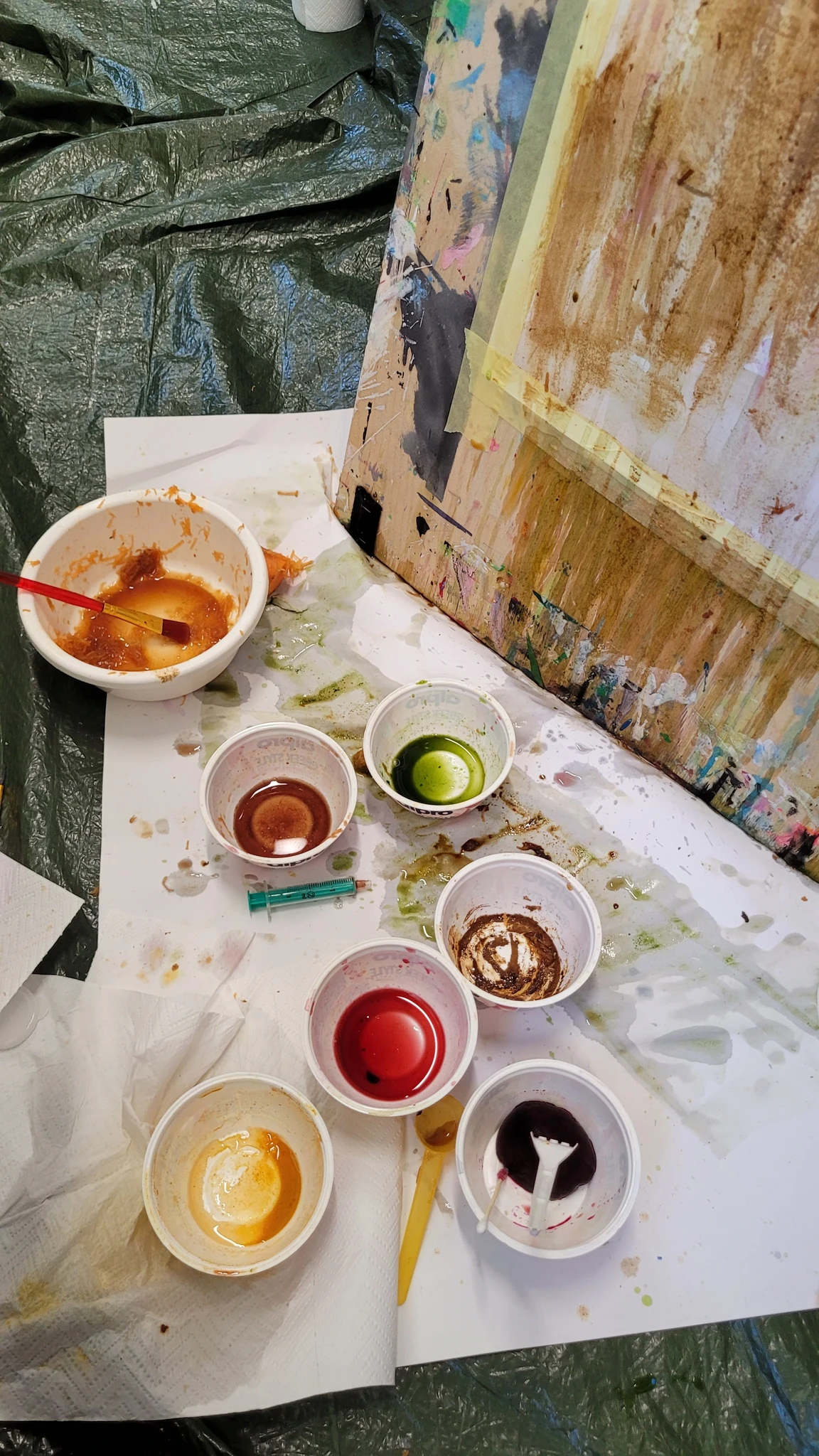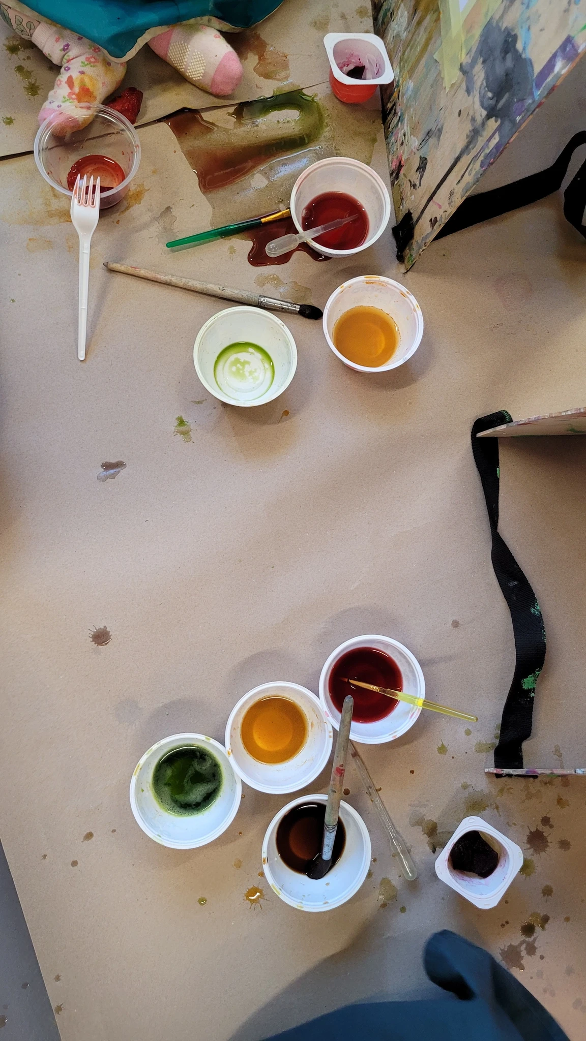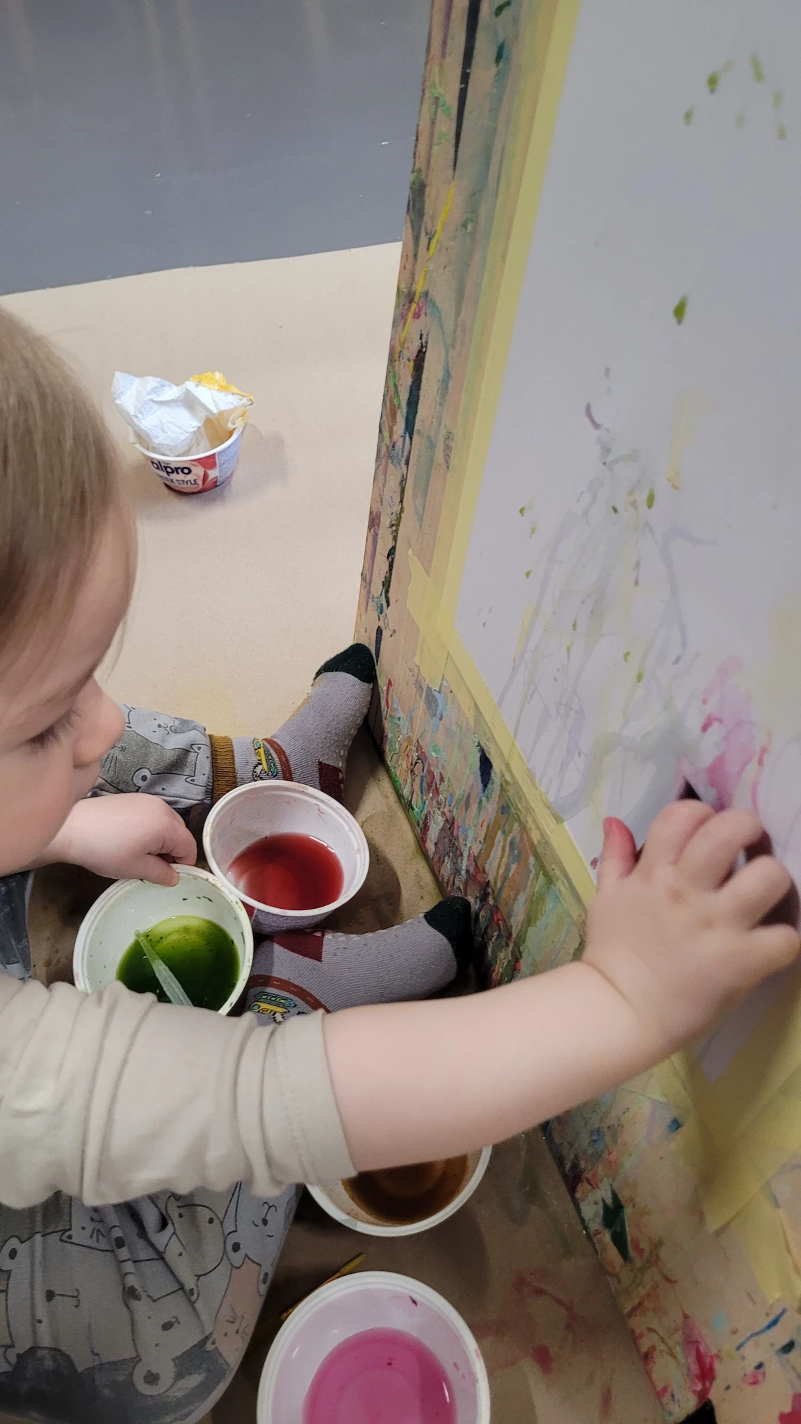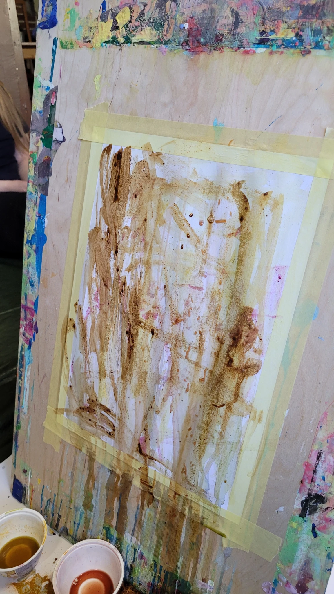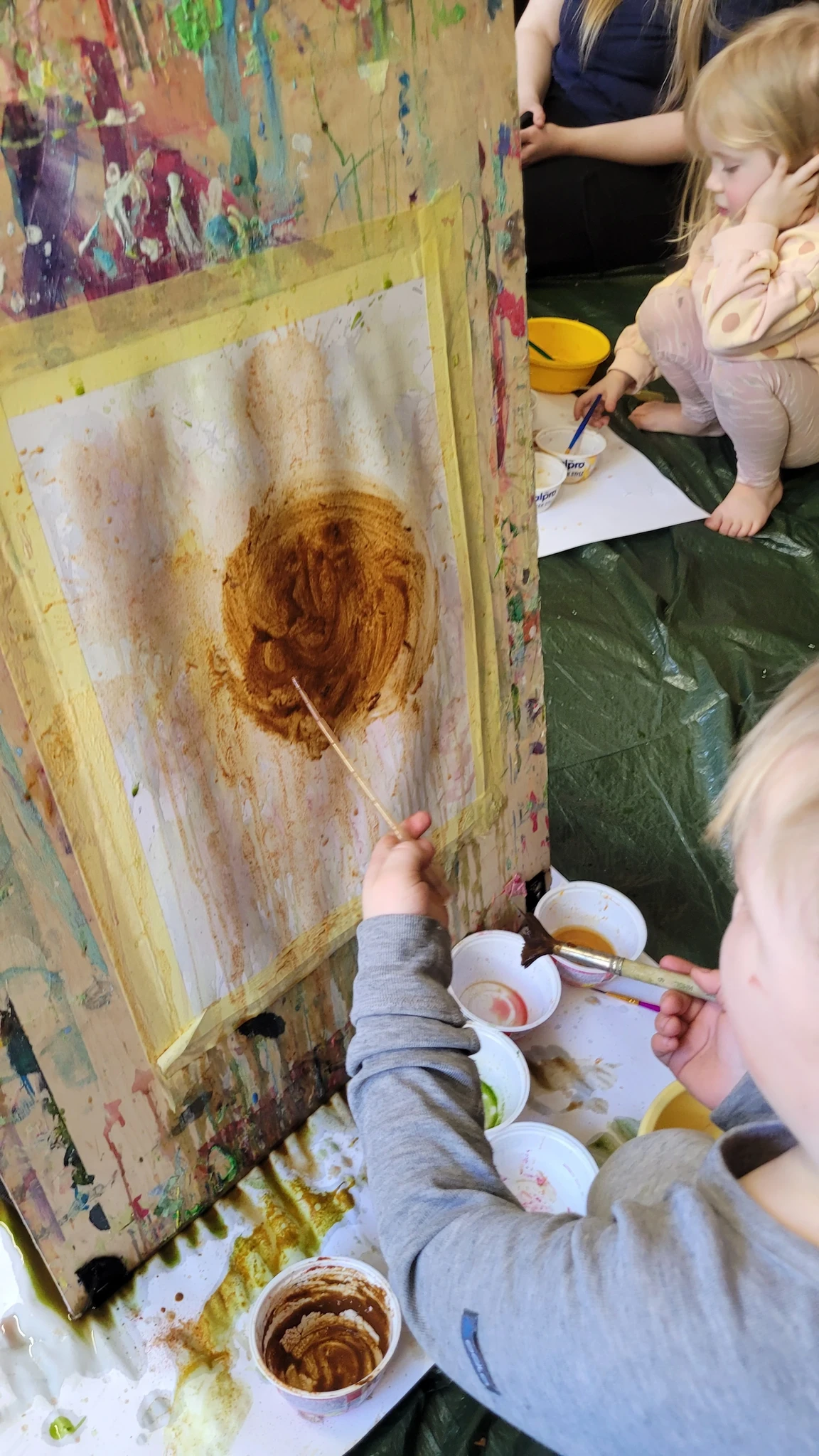 Panime endale seekord valmis maalialused ja kinnitasime sinna teibiga akvarellpaberi. Ja hakkasime justkui laborantideks, kes katsetavad köögis maalimist, muutes toiduasjad värvideks. Oma värvipotskusse segasime kurkumipulbri ja vee abil kollast, paprikapulbri ning veega oranzi ja kohvipuru ja veega pruuni. Siis testisime, kas teetõmmisest saaks mingit värvi. Kõige parem oli kibuvitsateest saadud punane. Punast sai väga hästi ka peeditükist, mida sai otse paberile vajutada. Oranzi proovisime samuti riivitud porgandist saada. Rohelist värvi tekitasime püreestatud spinatist ja lillast viinamarjamahlast. Proovisime peale pintsli kasutada ka pipetti ja süstalt värvi paberile kandmiseks ja niristamiseks. Oli huvitav vaadata, mis vedelikud tekitasid tugevama värvijälje ja mis heledama.