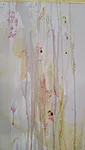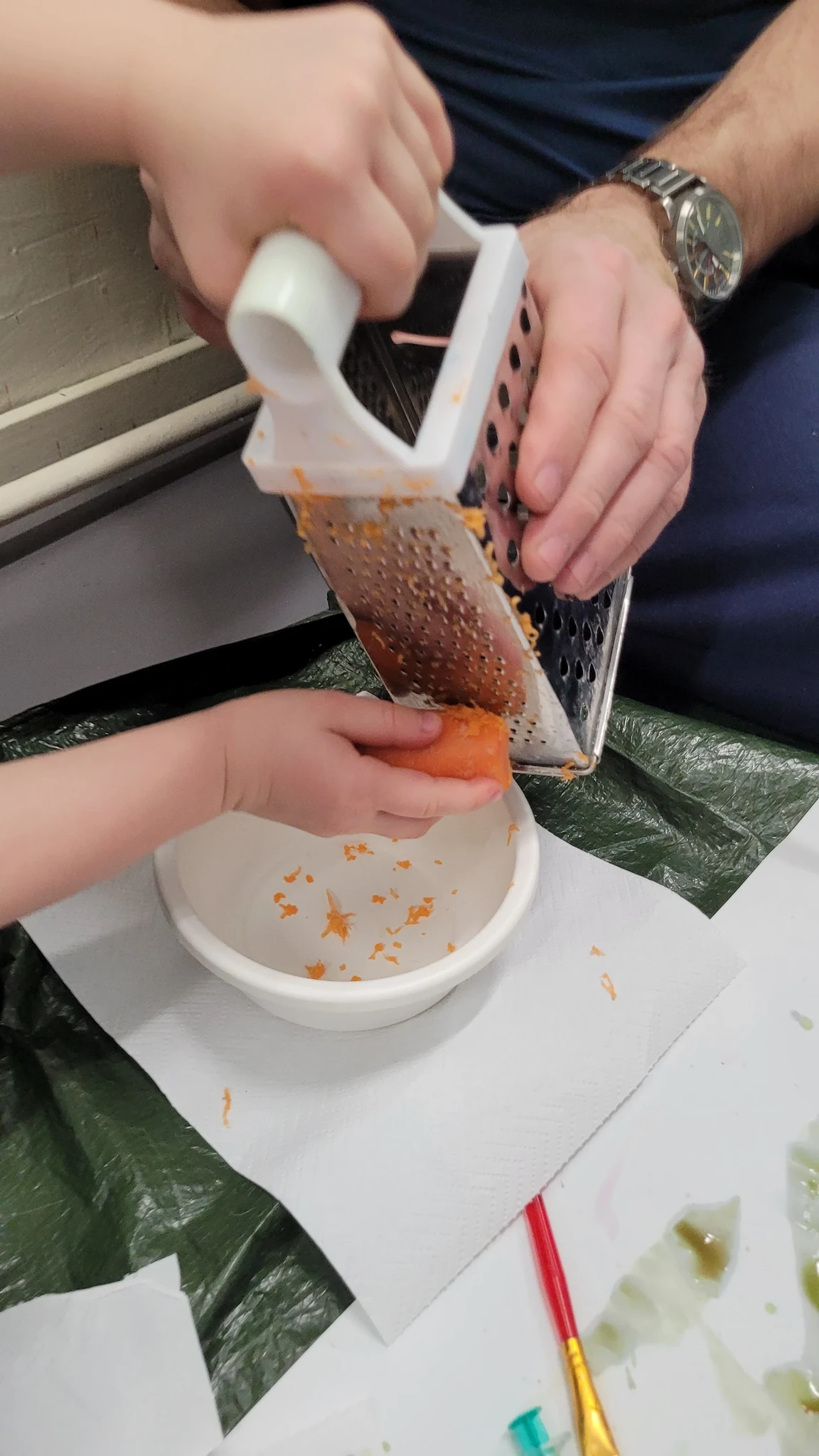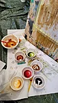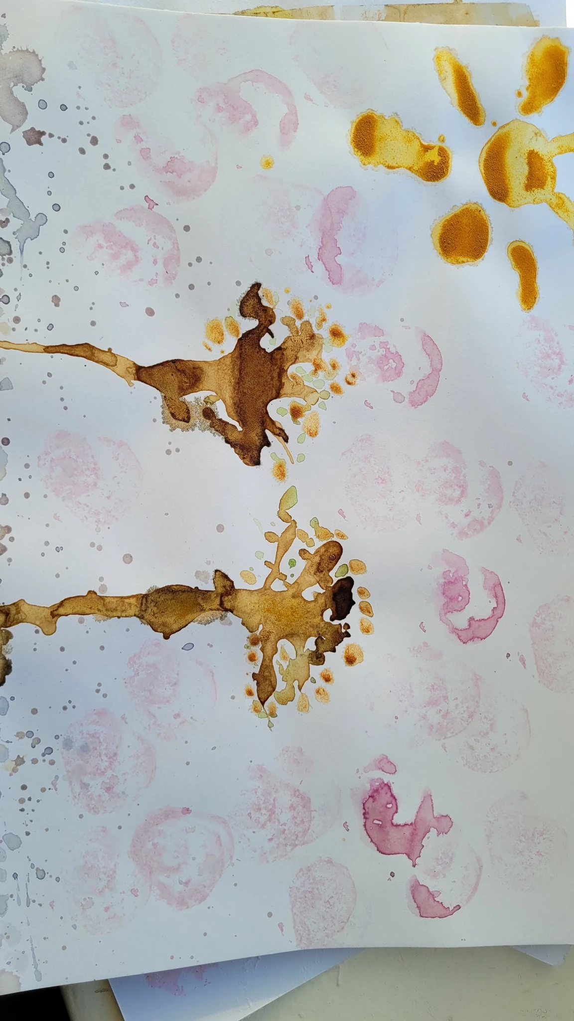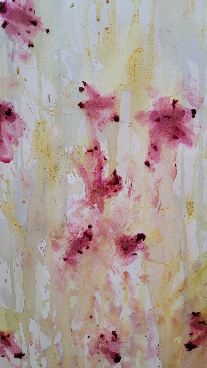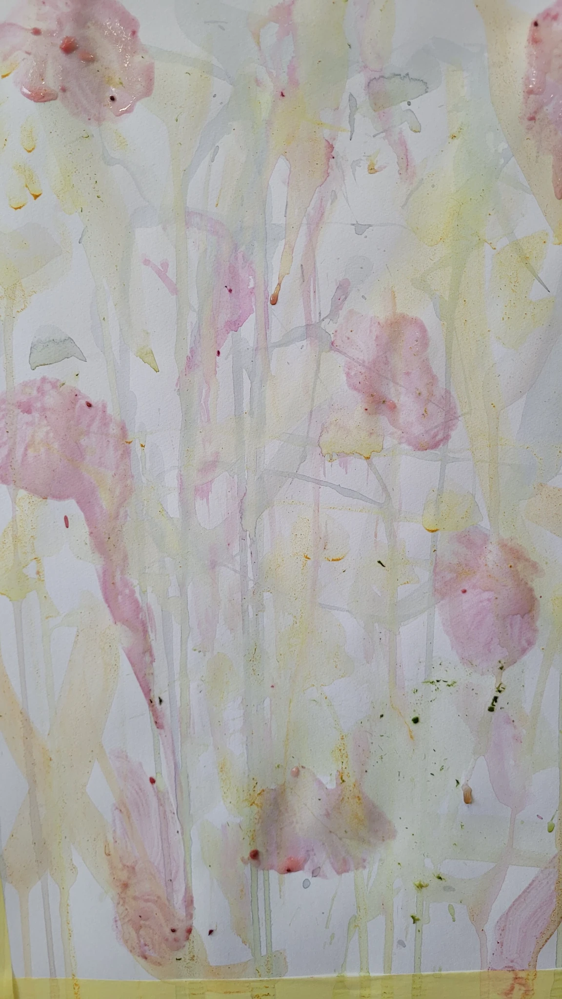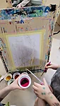 Panime endale seekord valmis maalialused ja kinnitasime sinna teibiga akvarellpaberi. Ja hakkasime justkui laborantideks, kes katsetavad köögis maalimist, muutes toiduasjad värvideks. Oma värvipotskusse segasime kurkumipulbri ja vee abil kollast, paprikapulbri ning veega oranzi ja kohvipuru ja veega pruuni. Siis testisime, kas teetõmmisest saaks mingit värvi. Kõige parem oli kibuvitsateest saadud punane. Punast sai väga hästi ka peeditükist, mida sai otse paberile vajutada. Oranzi proovisime samuti riivitud porgandist saada. Rohelist värvi tekitasime püreestatud spinatist ja lillast viinamarjamahlast. Proovisime peale pintsli kasutada ka pipetti ja süstalt värvi paberile kandmiseks ja niristamiseks. Oli huvitav vaadata, mis vedelikud tekitasid tugevama värvijälje ja mis heledama.